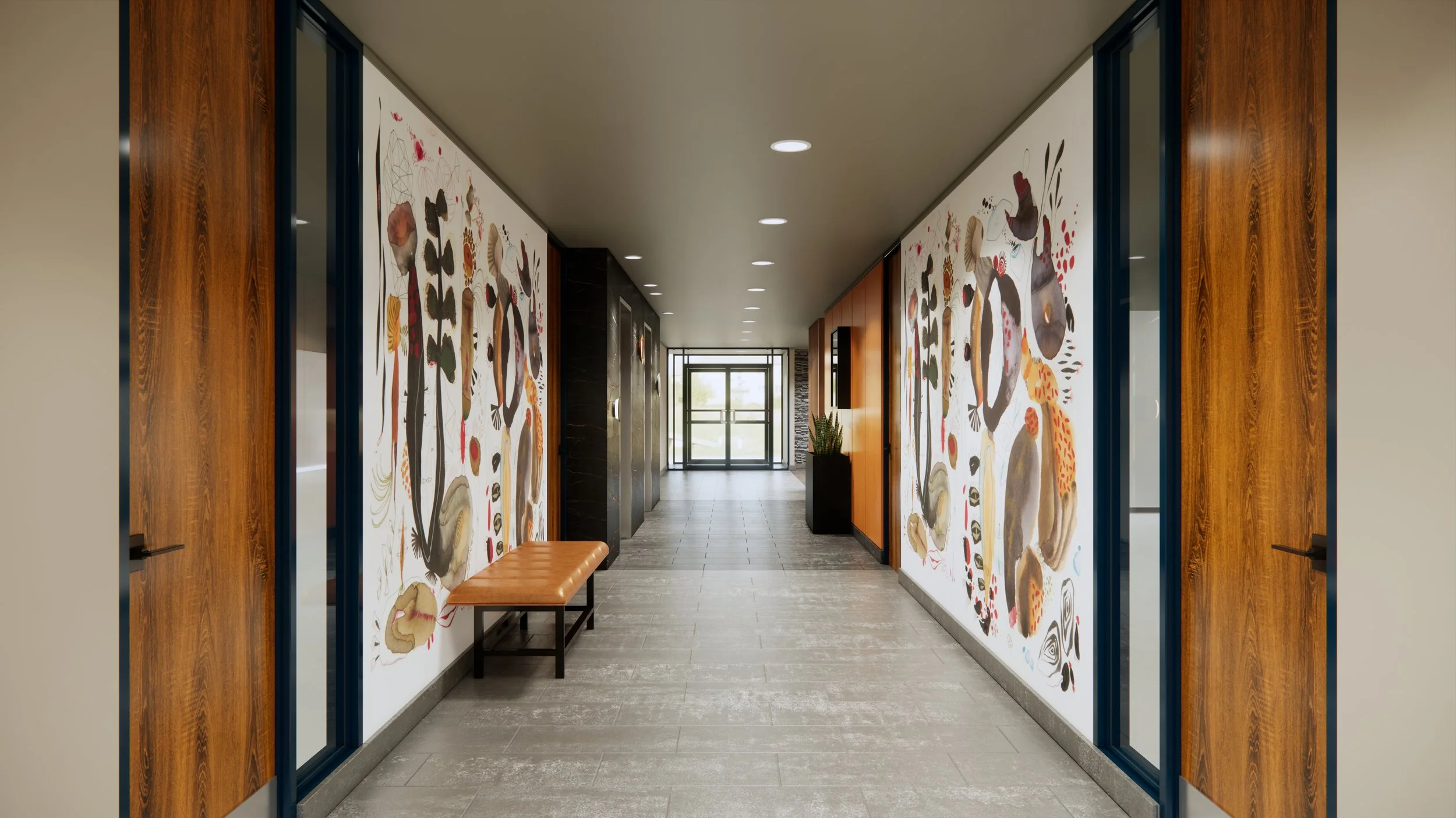The vibrant wallcovering by Area Environments is a main attraction offering intrigue and brightening. The Dekton-clad elevator corridor with its striking veining grounds the space and the playfully-placed light sconces bring a bit of whimsy.
